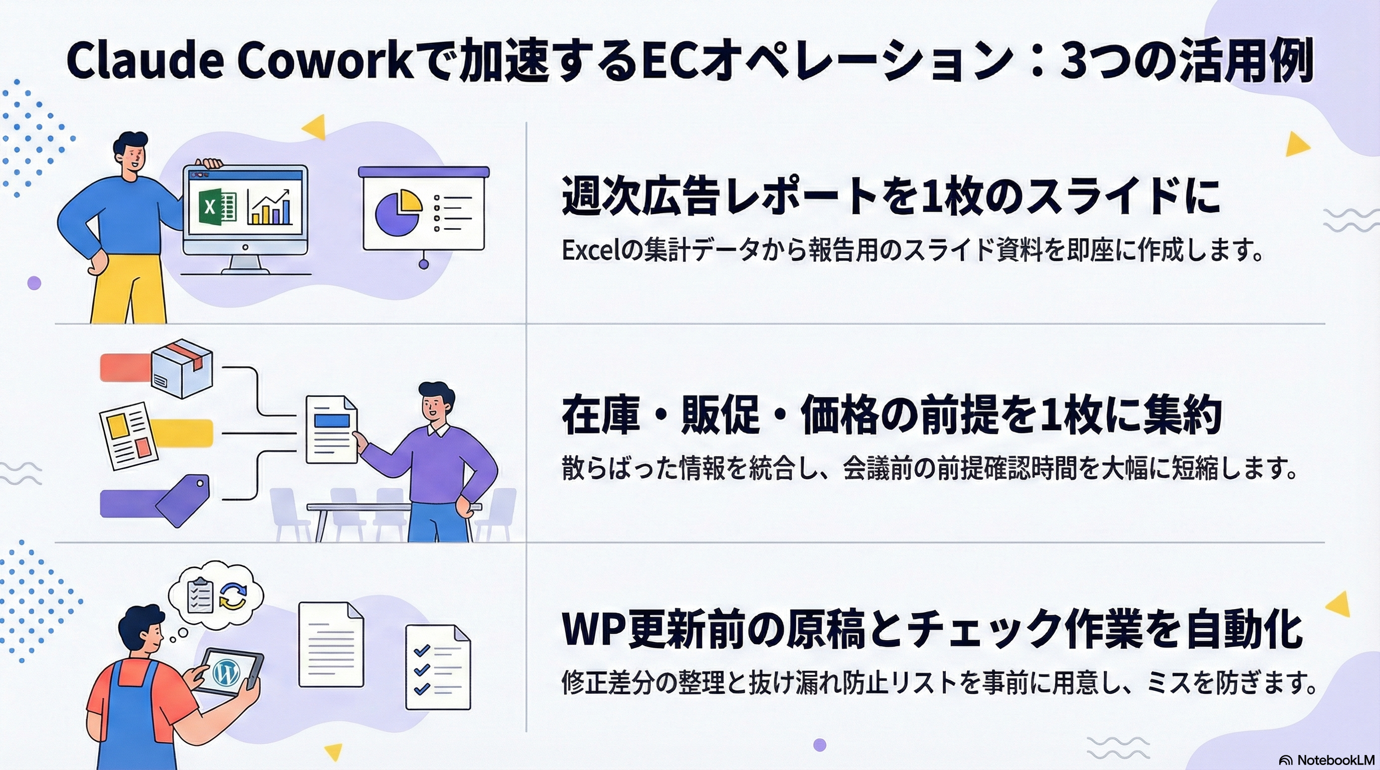 ECオペレーションでCoworkが刺さりやすいのは、作業が複数ツールや複数ファイルにまたがり、最後は資料やメモとして形にして終わる領域です。